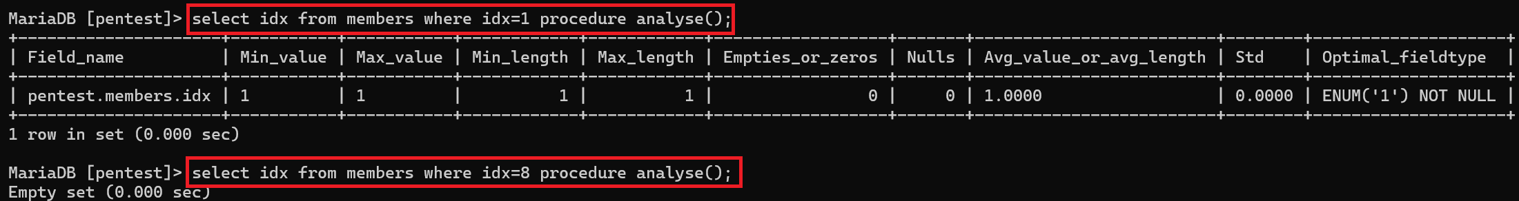 이제, 테이블에 대한 정보를 추출하기 위해 procedure analyse() 를 사용해준다.