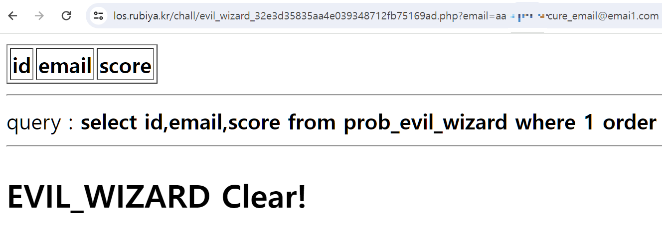 $query = "select id,email,score from prob_evil_wizard where 1 order by {$_GET[order]}"; // same with hell_fire? really?