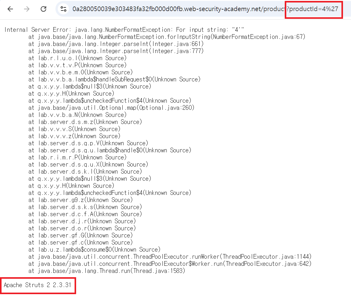 원래 파라미터 productId의 값으로 숫자가 와야하지만 '(%27)을 대입함으로써, 에러 페이지가 노출되었고, 관련 프레임워크 정보를 얻을 수 있었다.
