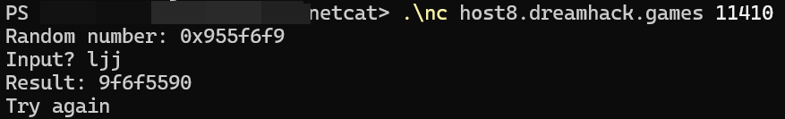 해당 문제는 nc로 해당 호스트에 접근 시, Random number 가 출력이 되고, Input? 이 printf 된 이후에 사용자 입력 값을 받는다. 그 후에 Result 값과 Try again이라는 문자열이 반환된다.