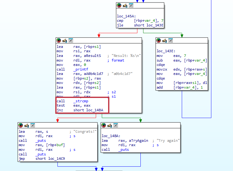 위 그림 2에서 Try again 문자열을 확인할 수 있고, 위 분기문을 확인했을 때, strcmp 비교를 한 후 왼쪽과 오른쪽 분기로 나눠짐을 알 수 있다.